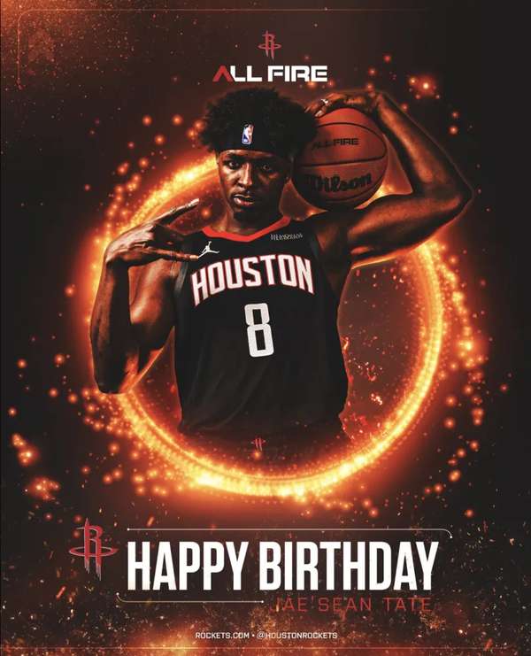 休斯顿火箭队官方社交媒体今日发布球员杰肖恩-泰特的庆生海报,为这位锋线球员送上30岁生日祝福。海报配文写道:"生日快乐,JT!让我们向Jae'Sean表达爱意吧,H-Town!"