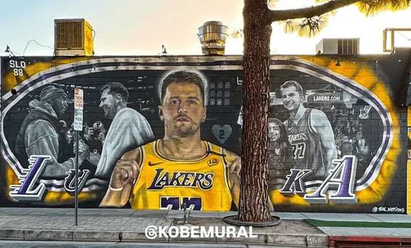 一幅融合篮球传承与深情纪念的壁画近日出现在加州伯班克市Magnolia Blvd的The Morrison餐厅外墙。画面中心是达拉斯独行侠队核心卢卡-东契奇身着金色战袍的英姿,两侧分别呈现已故传奇科比-布莱恩特及其女儿吉安娜的形象。