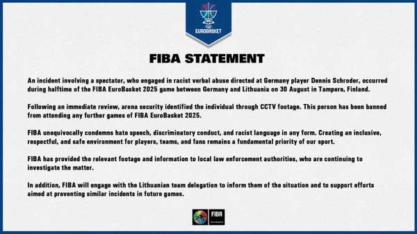 施罗德在接受采访时指出,部分立陶宛球迷模仿猴子叫声,这一行为令他深感震惊与不满。他坚决表示,无法接受任何形式的种族歧视言论或举动。国际篮联(FIBA)迅速介入,于8月31日发布官方声明,确认有一名观众在比赛中场时段对施罗德进行了种族主义辱骂。
