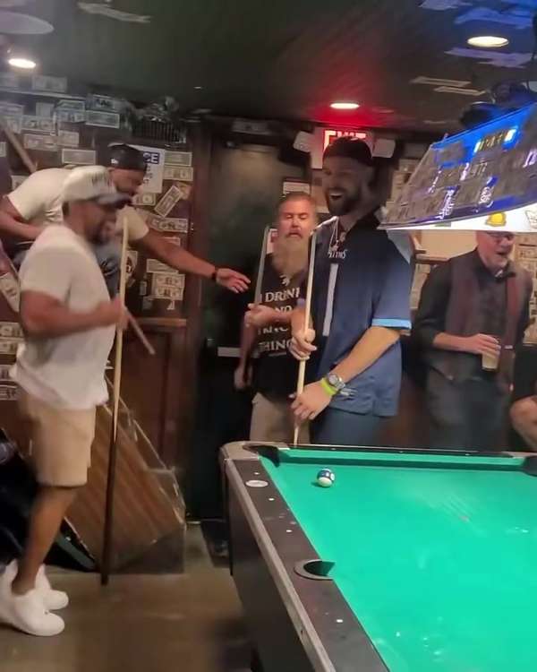 在一家休闲酒吧内,独行侠球星克莱·汤普森被目击参与了一场气氛活跃的台球比赛。他的对手在关键时刻出现失误,未能将黑球击入袋中,克莱借此机会完成逆转,顺利赢得该局胜利。